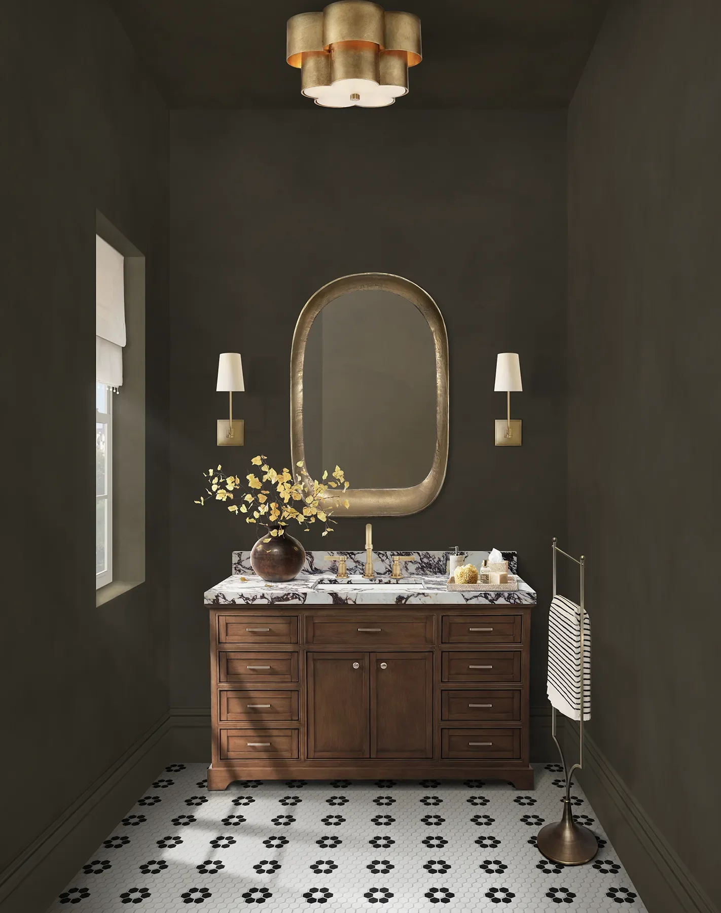 The warm wood vanity and richly veined marble top offer a grounded counterpoint to the sculptural elements, striking a balance between drama and restraint. A layered, curated composition tailored for those who appreciate timeless design with a bold edge.